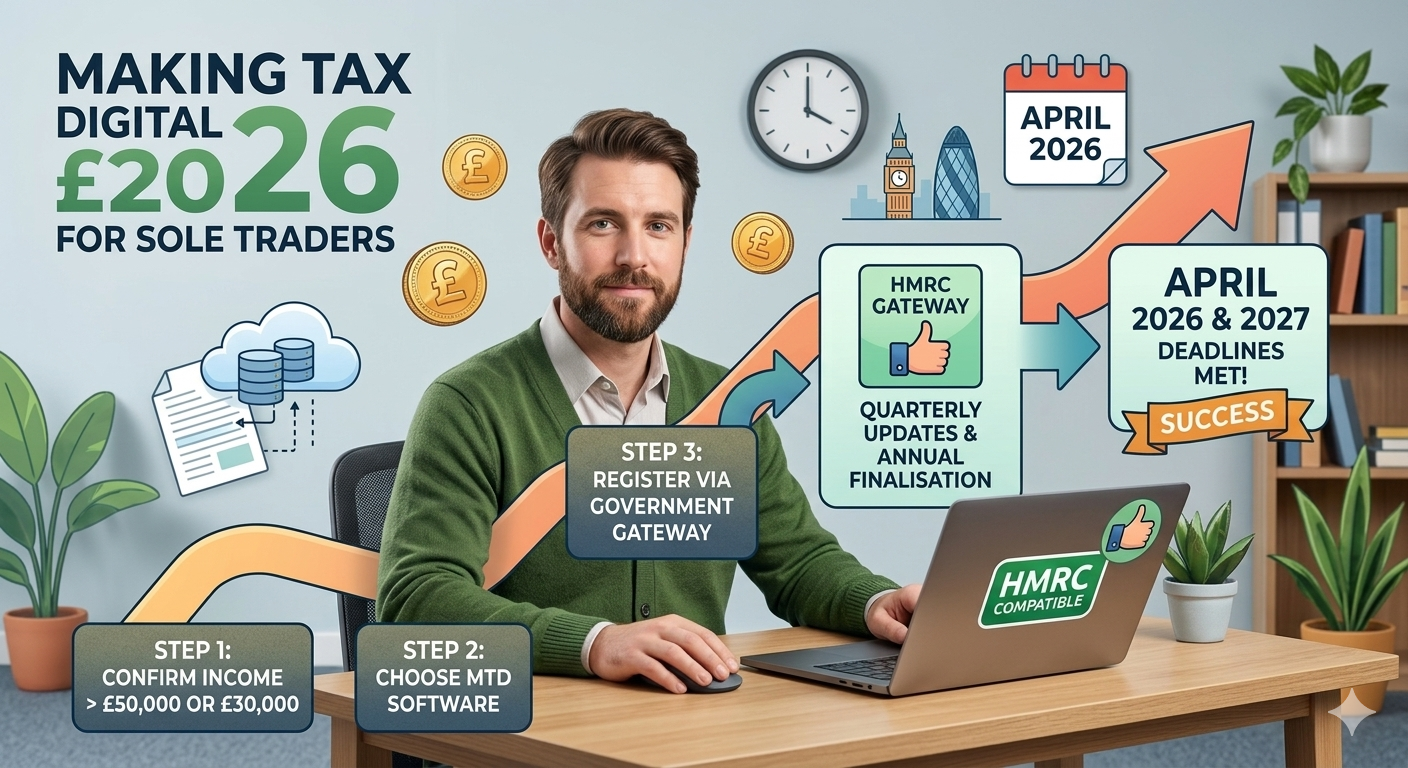 Making Tax Digital for Income Tax is no longer a distant tax change UK sole traders can ignore. If your qualifying income from self-employment and property was over £50,000 in the 2024 to 2025 tax year, HMRC says you will need to use it from 6 April 2026. If it was over £30,000 in the 2025 to 2026 tax year, your start date becomes 6 April 2027. The threshold is also set to widen again from 6 April 2028 for people over £20,000 in the 2026 to 2027 tax year.